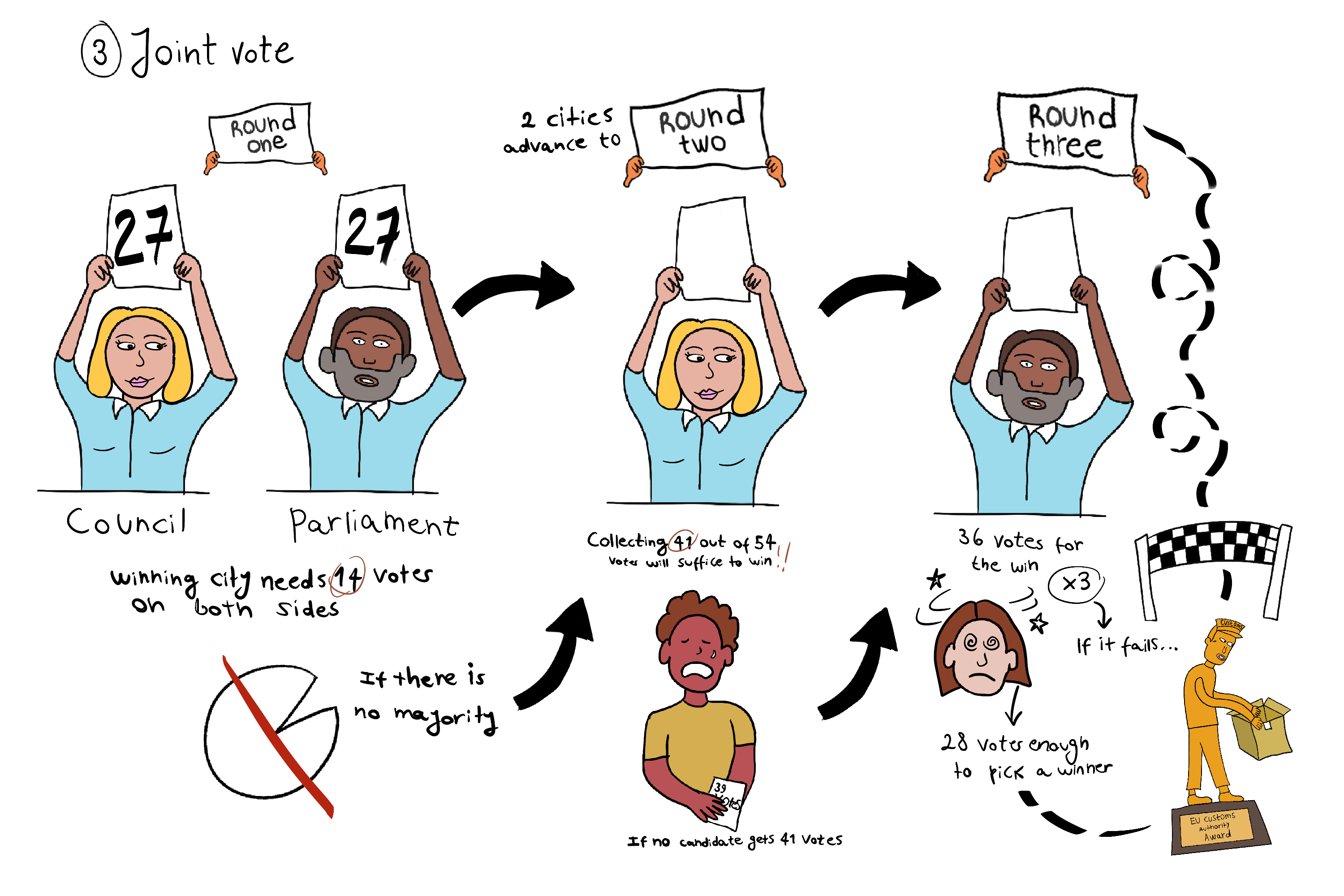 The Council and the Parliament will both get 27 votes, with lawmakers represented by lead negotiator Dirk Gotink of the EPP and Anna Cavazzini of the Greens. In the first joint round of voting, the winning city would need 14 votes on either side of the divide. If there are more than two candidates, the two lowest drop out of the race.