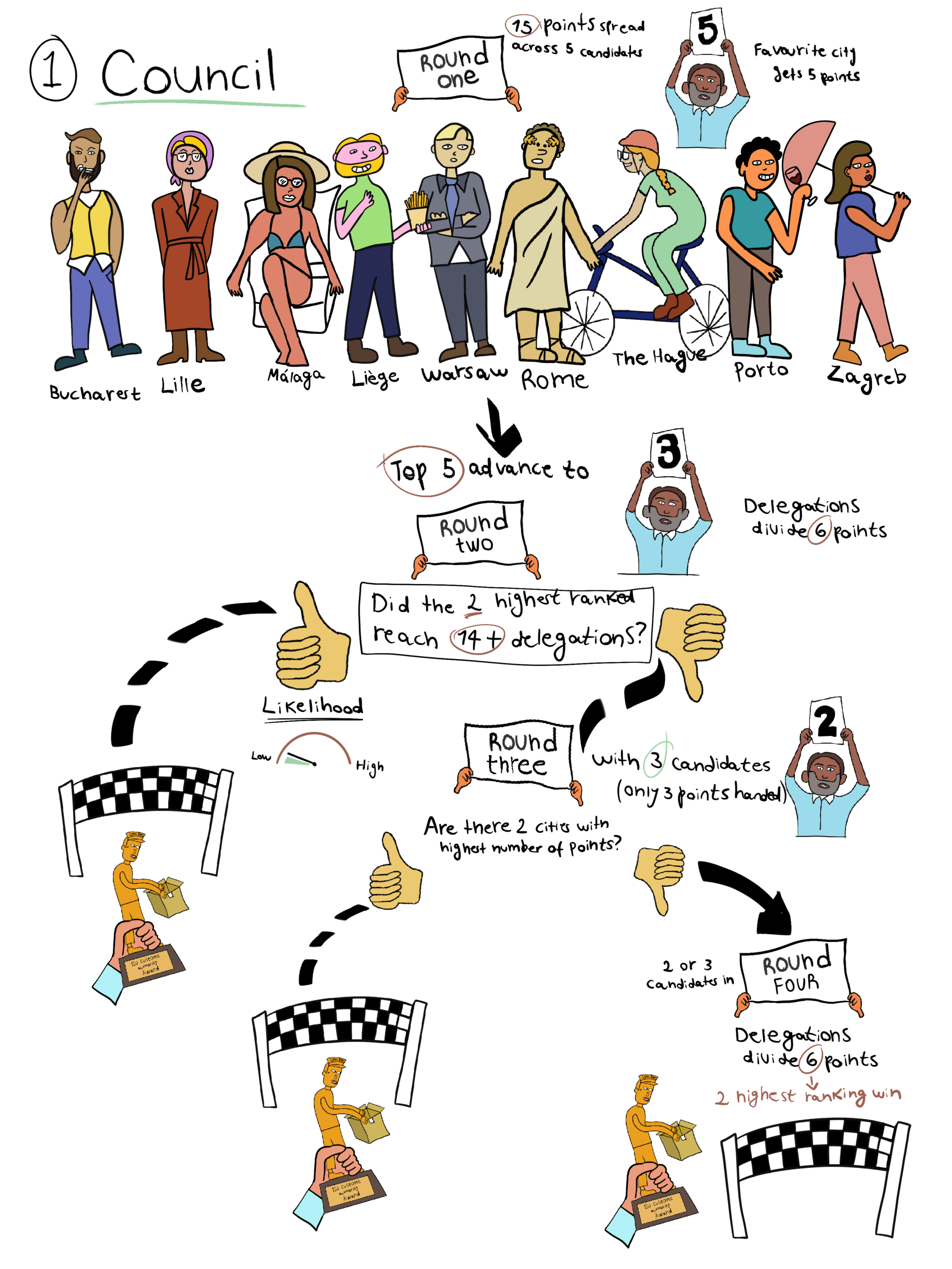 The EU capitals will need at least two — and maybe four — rounds to select their duo, plus a final one to rank them. The first round starts with each national delegation spreading 15 points across five different candidates. The favorite city gets five points, the second four, and so on. Once the points are counted, the top five cities advance to the next round. They would be joined by a sixth city in case there’s a tie for fifth spot.