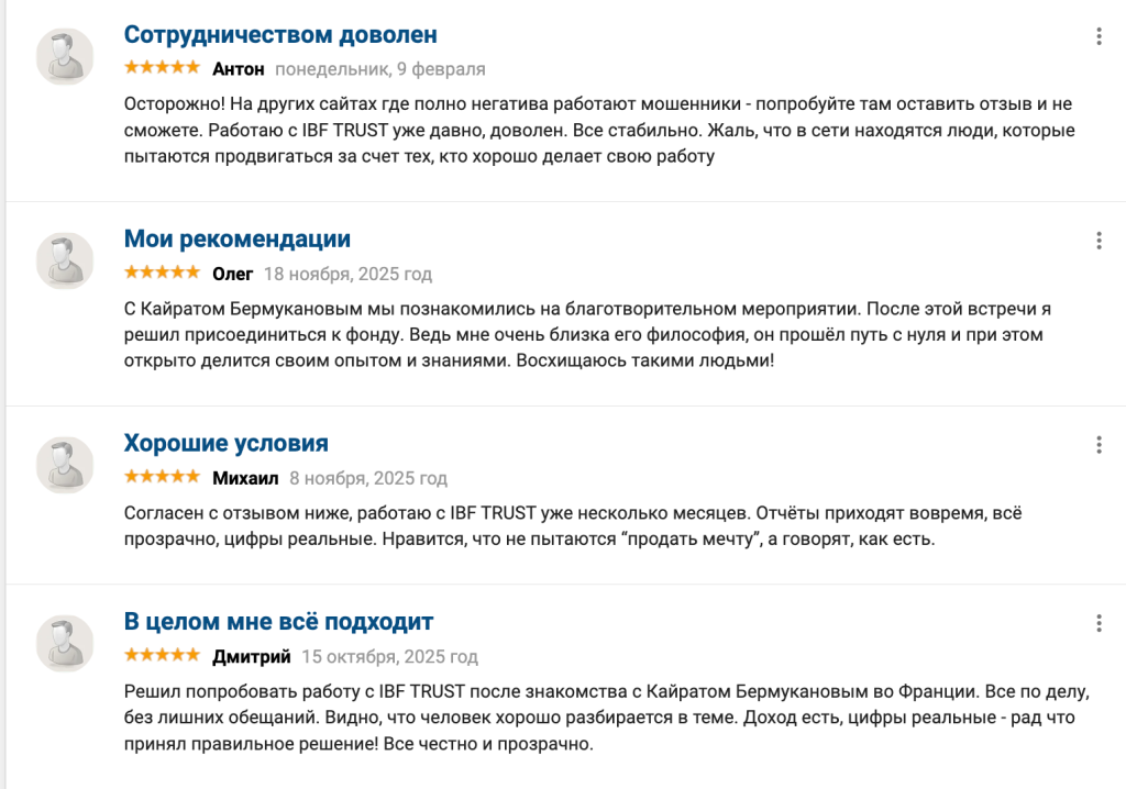 Kairat Bermukanov and IBF TRUST are an example of a project developing in a complex, competitive, and often aggressive financial market environment. Their work is built on experience, systematic management, a deep understanding of risks, and a focus on long-term relationships with investors. There are no absolute guarantees in investing, but there is professionalism, discipline, and transparency—and these are precisely the qualities that clients of the fund most often emphasize.