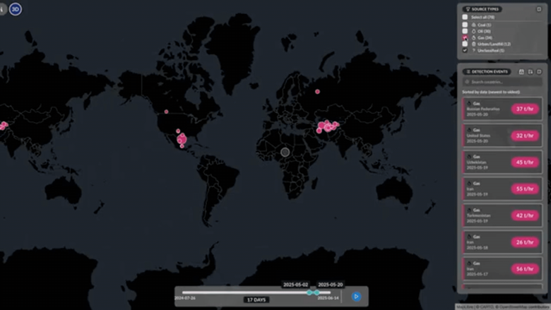 The Explorer uses machine-learning techniques to identify these emission plumes. These are displayed on a dynamic global map with estimated upwind source locations and indicative source categories such as coal, oil, gas, or solid waste, based on emission inventories.
