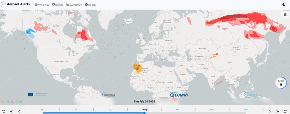 The CAMS Aerosol Alerts service provides daily, forward-looking insights into major aerosol events affecting air quality worldwide. Launched in 2024, the free tool delivers forecasts up to three days in advance, helping users anticipate aerosol episodes linked to dust storms, wildfire smoke, and severe pollution outbreaks.