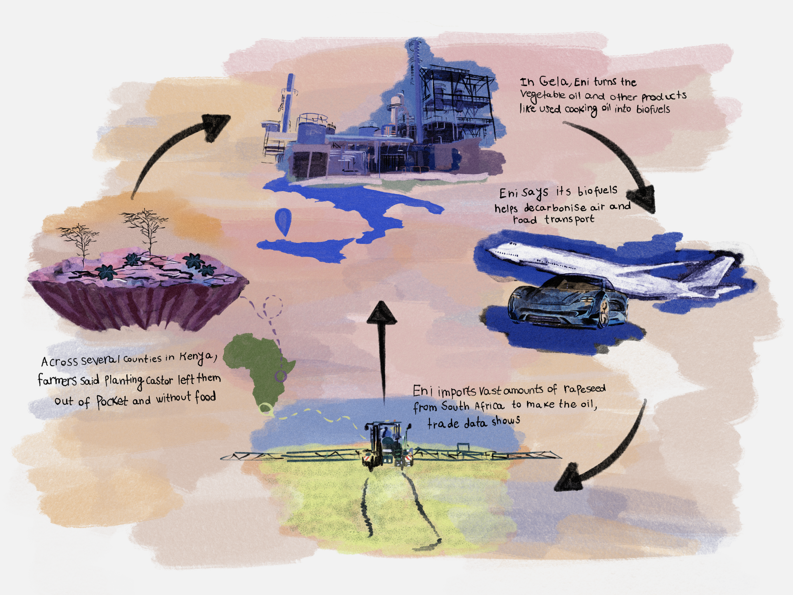 Today, Eni’s Kenyan operation is sending tens of thousands of tons of vegetable oil back to its refinery in Sicily each year to make biofuels for planes, cars and trucks.