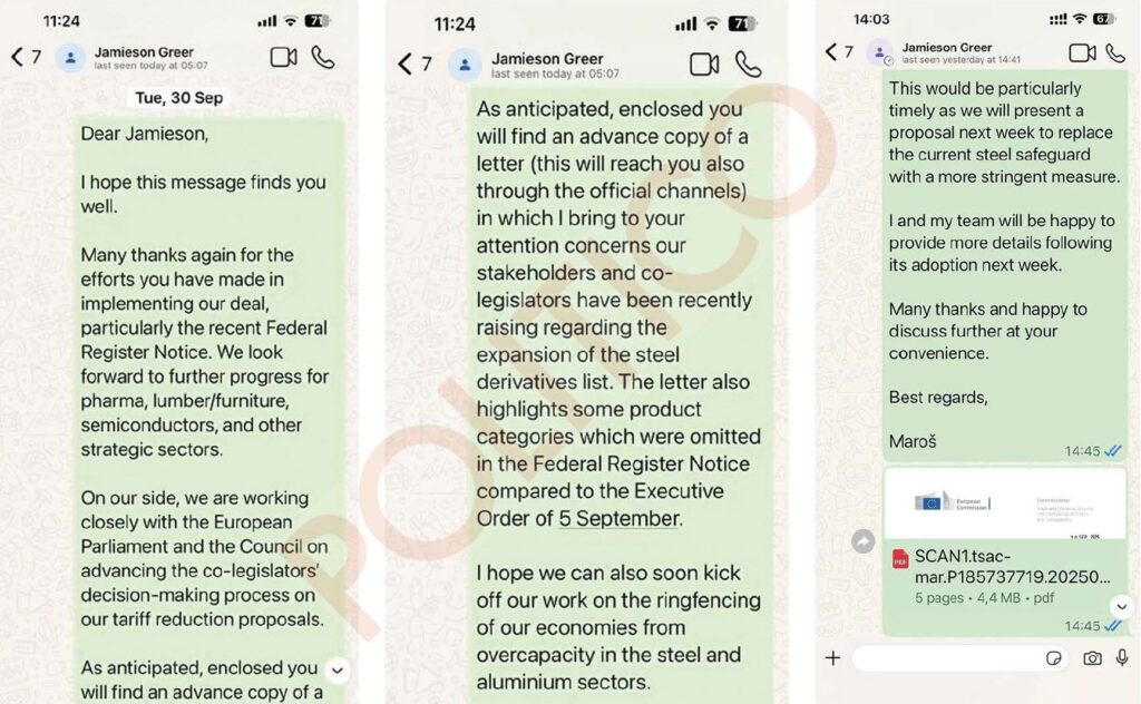 “EU stakeholders, constituencies, and businesses are increasingly expressing strong concerns,” Šefčovič wrote last September via WhatsApp to Greer and on Signal to Lutnick.